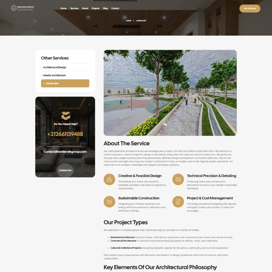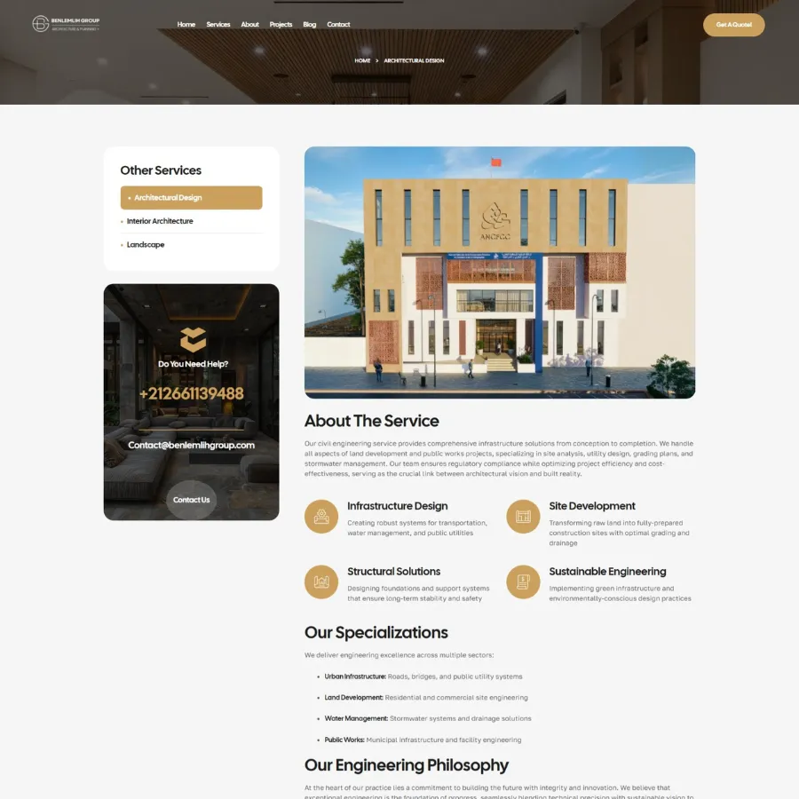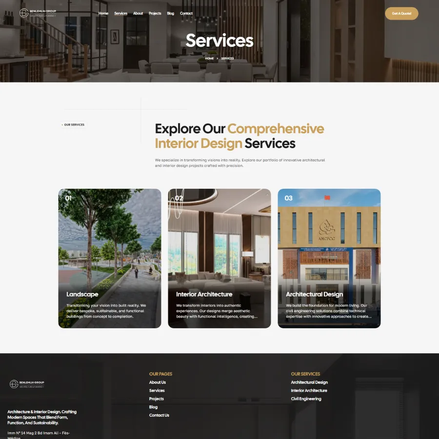 Where structural engineering meets artistic vision. Benlemlih Group, an established firm based in Fès-Médina with over 10 years of experience, required a digital presence that mirrored their physical craftsmanship. They needed a corporate website that could seamlessly display their three core pillars: Architectural Design, Interior Architecture, and Civil Engineering .
