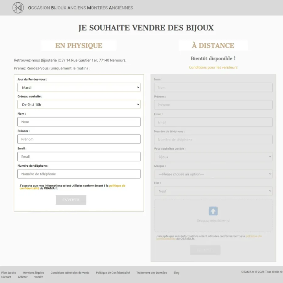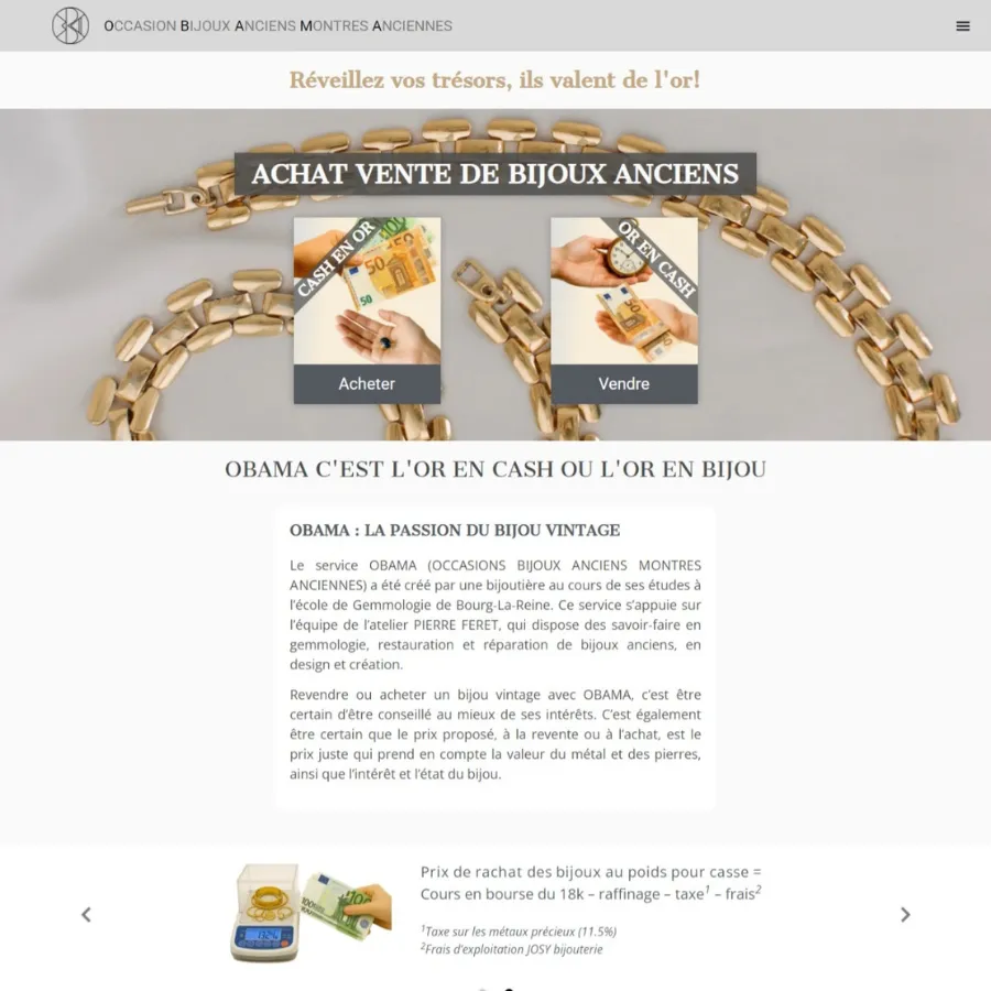 Where gemological expertise meets the digital vintage market. OBAMA (Occasion Bijoux Anciens Montres Anciennes) is a specialized platform created by gemology experts from the renowned École de Bourg-La-Reine. Backed by the technical know-how of Atelier Pierre Feret, the client needed a digital solution that could facilitate both the sale of restored vintage treasures and the purchase of gold from individuals. We delivered a sophisticated e-commerce platform that bridges the gap between a traditional jewelry workshop and the modern digital buyer.